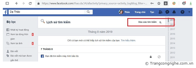 Hướng dẫn xóa lịch sử tìm kiếm Facebook trên Website