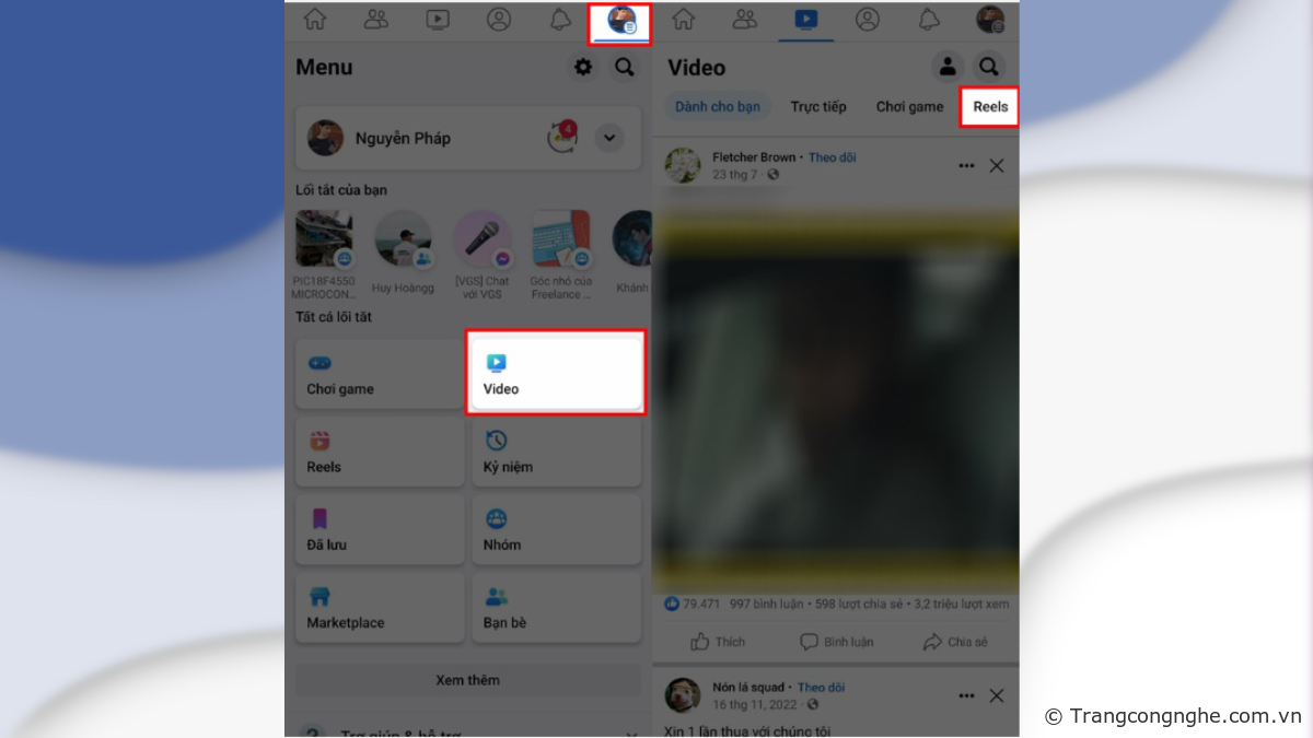 Bước 2: Mở tab Reels trên Facebook, chọn vào một video bất kỳ. Nếu bạn không biết vị trí mục Reels, bạn hãy truy cập biểu tượng menu ở cuối cùng của thanh điều hướng → chọn Video. Tại đây, loạt danh mục video phía trên bao gồm: Dành cho bạn, Trực tiếp, Chơi game, Reels sẽ hiện ra. Bạn chỉ cần ấn vào Reels ở cuối là xong.
