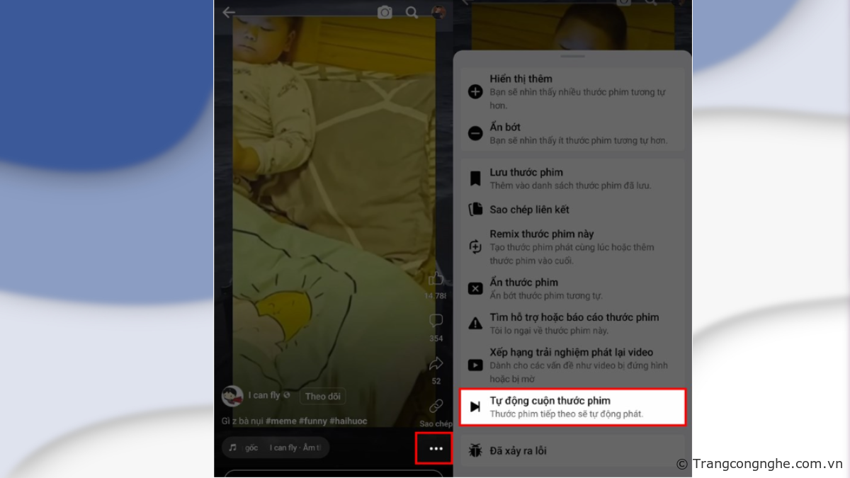 Bước 3: Trong video Reels bất kỳ mở ra, bạn chọn biểu tượng 3 chấm ngang (…) ở góc dưới cùng bên phải màn hình hiển thị. Trong menu các tùy chọn sẽ xuất hiện mục Tự động cuộn thước phim. Bạn ấn chọn mục này là xong.