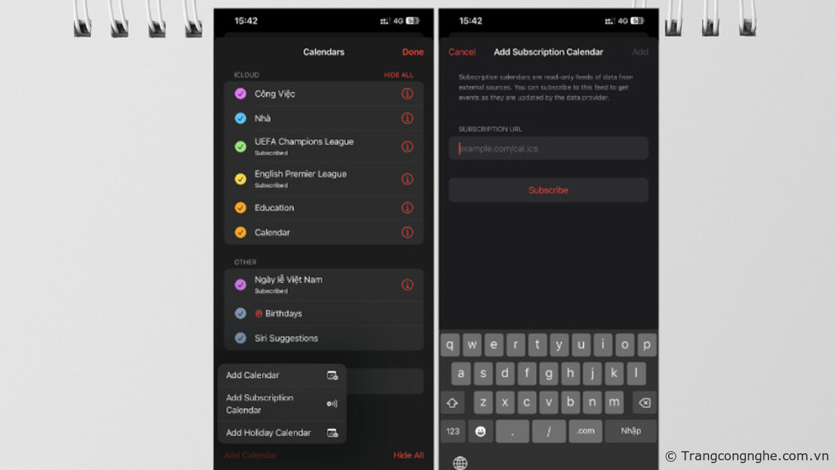 Với những sự kiện diễn ra trong thời gian dài (chẳng hạn như bóng đá C1 hoặc EPL), bạn có thể dùng Apple Calendar để theo dõi xuyên suốt bằng cách nhấn vào Thêm lịch → chọn Subscription Calendar sau đó dán link sự kiện vào là được. Trong trường hợp trang web của sự kiện đó có hỗ trợ dẫn link trực tiếp về ứng dụng, bạn chỉ cần truy cập và thêm vào lịch để hoàn tất.