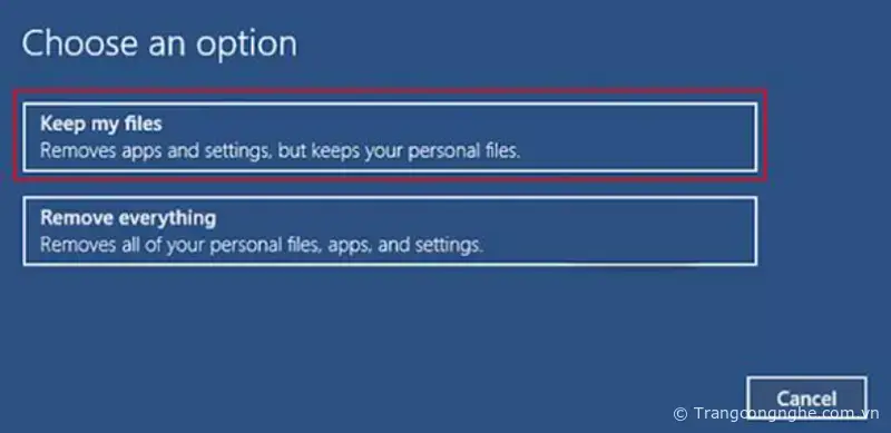 Bước 5: Tại hộp thoại Choose an option mới hiển thị 2 tùy chọn Keep my files và Remove everything với các tính năng chính như sau:Keep my files : Xóa toàn bộ ứng dụng và cài đặt lại thiết lập trên máy tính về trạng thái ban đầu nhưng vẫn lưu lại những dữ liệu cá nhân.
