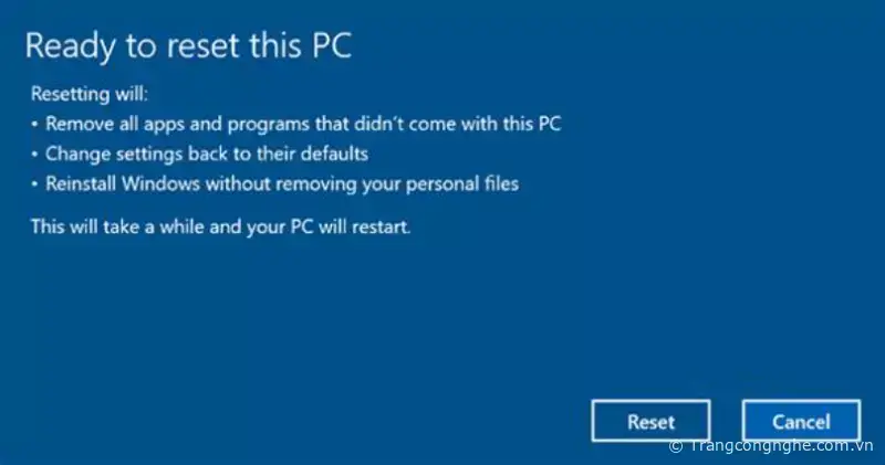 Bước 8: Trên màn hình cuối cùng sẽ hiển thị mục Ready to reset this PC, bạn nhấn chọn Reset để khởi động lại máy tính và bắt đầu quá trình reset Windows về trạng thái ban đầu. Thông thường quá trình reset sẽ mất khoảng 20 – 60 phút.