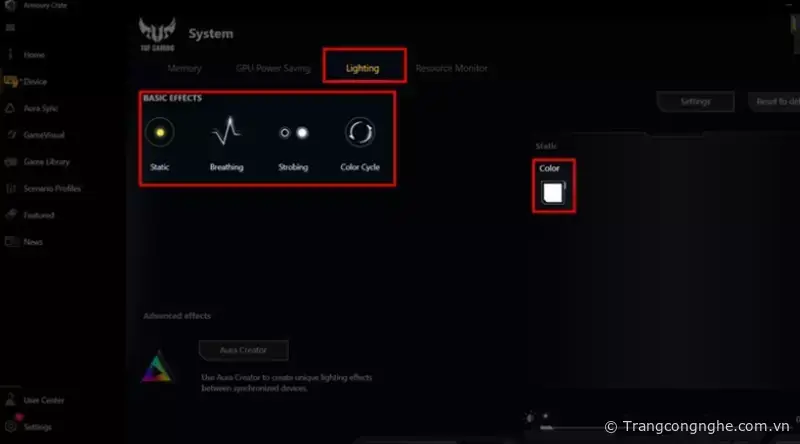 Bước 4: Để chỉnh đèn thì bạn hãy chọn tiếp vào phần Lighting, nó sẽ có một vài kiểu đèn cho bạn chọn. Bạn có thể xem và chọn kiểu sáng đèn mình thích sau đó chọn tiếp màu sắc ở mục Color. Việc chọn màu sắc đèn bàn phím chỉ sử dụng được cho một số chế độ nhất định thôi nhé.