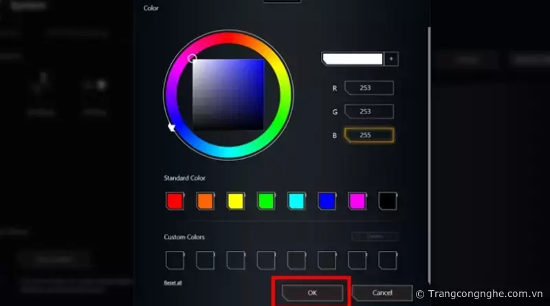 Bước 5: Dùng chuột chọn màu bạn thích rồi ấn vào OK là xong thôi. Ngoài ra, bạn cũng có thể sử dụng tổ hợp phím Fn + mũi tên lên hay xuống để thay đổi độ sáng của bàn phím laptop đó.