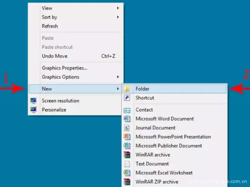 - Trong menu ngữ cảnh, di chuyển chuột đến 'New' (Tạo mới), sau đó chọn 'Folder' (Thư mục) từ danh sách hiện ra.