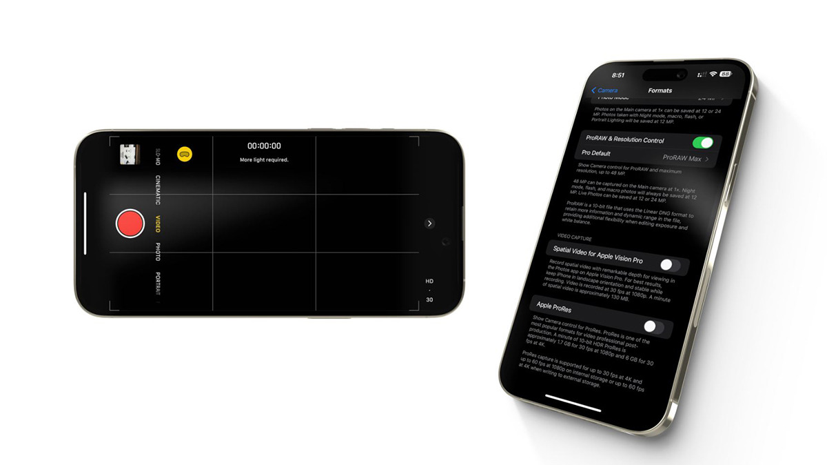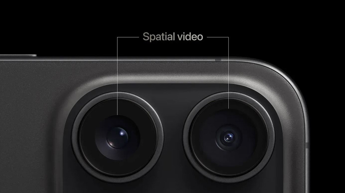 Trên iPhone 15 Pro và iPhone 15 Pro Max, có thể quay video không gian một cách nguyên bản bằng cách kết hợp video được ghi lại bởi cảm biến của camera chính và camera siêu rộng, tạo ra video lập thể.