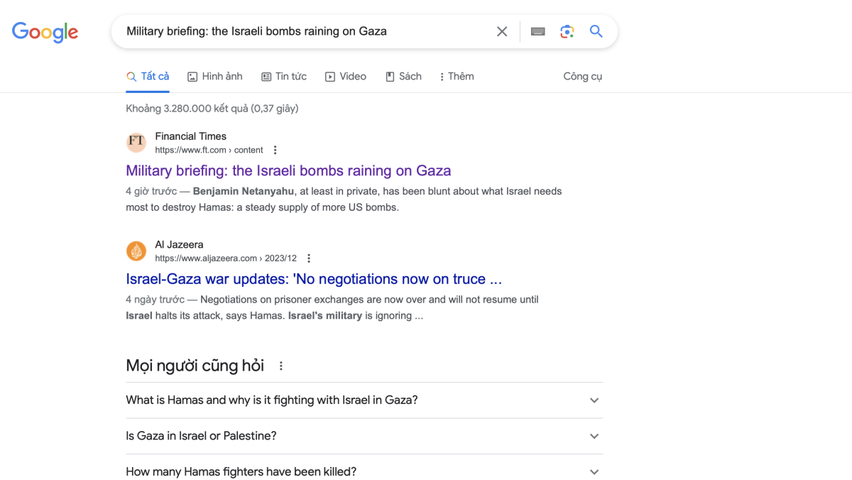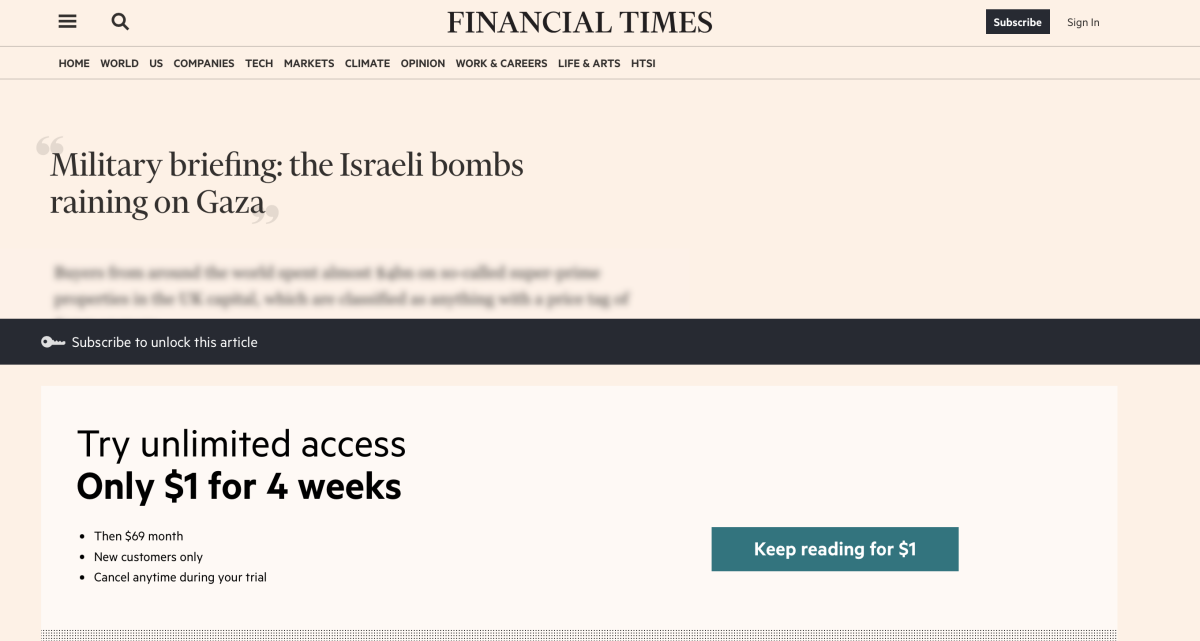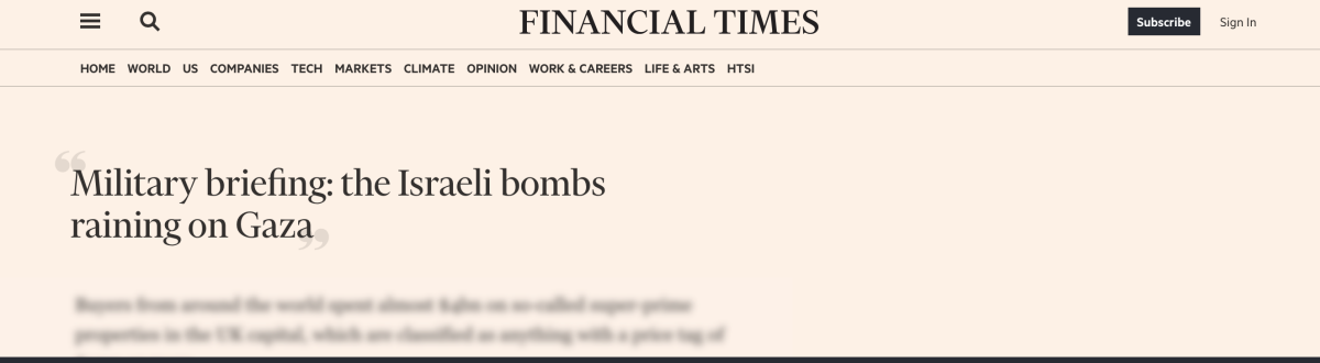 Bước 1: Xác định tiêu đề bài viết trên trang ft.com. Ví dụ : "Military briefing: the Israeli bombs raining on Gaza" như hình bên dưới.