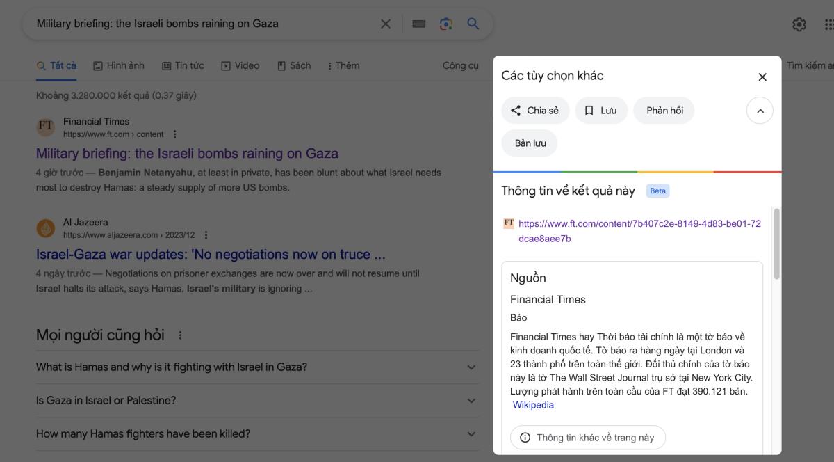 Bước 3: Tại kết quả của ft.com chọn dấu 3 chấm. Trình duyệt sẽ tối đi và hiển thị khung bên phải về thông tin bài viết. Bạn chọn "Bản lưu".