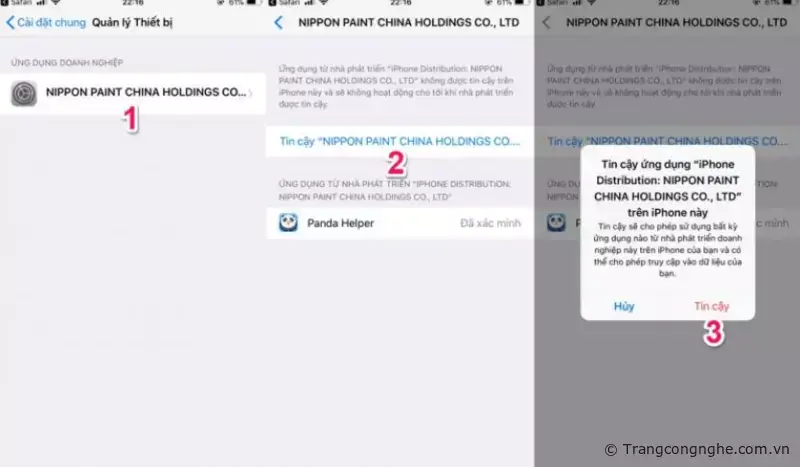 B3: Sau khi quá trình tải về và cài đặt Panda Helper hoàn tất, bạn cần cấp quyền tin cậy cho nhà phát triển. Mở Cài đặt > Quản lý cấu hình & thiết bị > nhấn nút Tin cậy Nippon Paint China...
