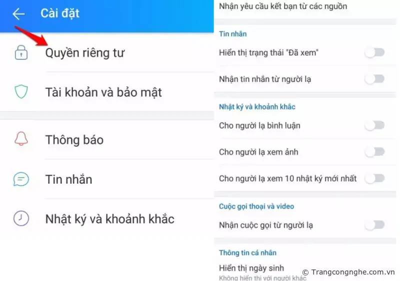 Bạn có thể tắt các tính năng như: Cho người lạ bình luận, cho người lạ xem ảnh, cho người lạ xem nhật ký, nhận cuộc gọi từ người lạ và tắt hiển thị ngày sinh.