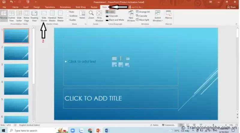Đầu tiên, để mở Slide Master, tại tab View, bạn hãy chọn vào Slide Master.