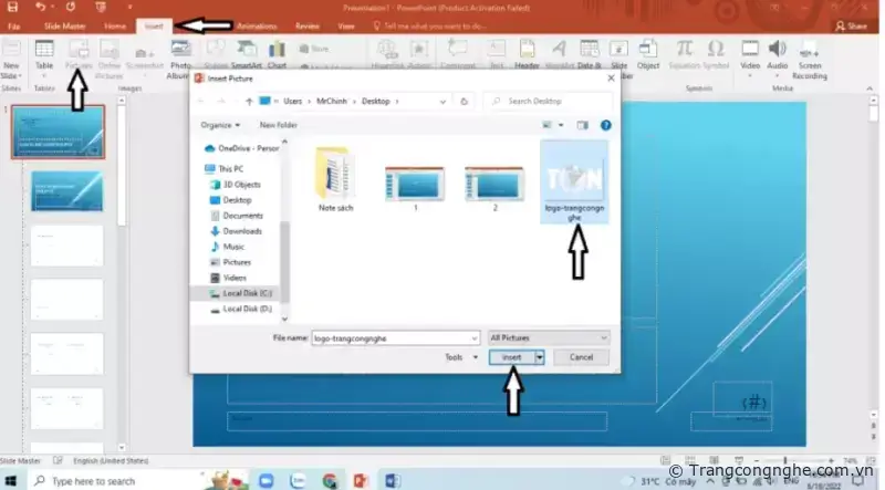 Để chèn logo vào PowerPoint, tại tab Insert, bạn hãy chọn vào Pictures. Khi cửa sổ hiện ra, bạn tìm đường dẫn đến ảnh logo cần chèn, sau đó nhấn Insert.