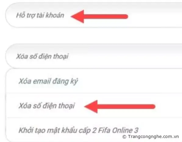 Bước 8: Tại đây bạn chọn mục hỗ trợ tài khoản và tiếp theo là xóa số điện thoại .