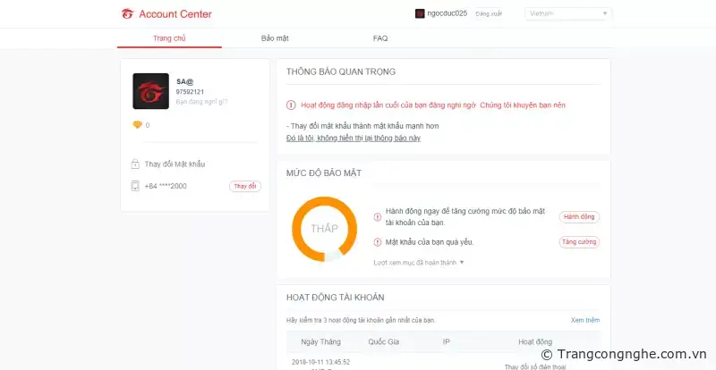 Bước 2: Sau khi đăng nhập Garena thành công bạn sẽ thấy trên giao diện người dùng có hiện số của bạn và ngoài ra không còn bất cứ thông báo nào của Garena về việc bảo mật điện thoại nữa là được.