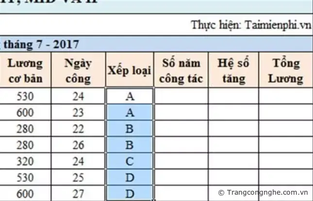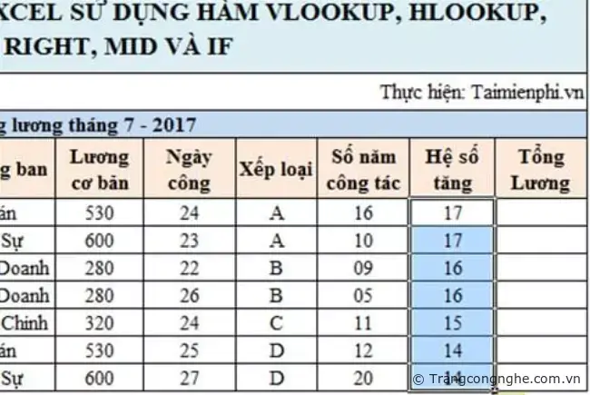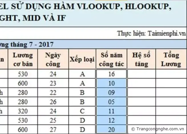 Hệ số lương sẽ phải phụ thuộc vào mã Xếp loại và Số năm công tác đã có trong Bảng hệ số. Ở đây chúng ta sẽ kết hợp hàng If với hàm Vlookup để tính toán.
