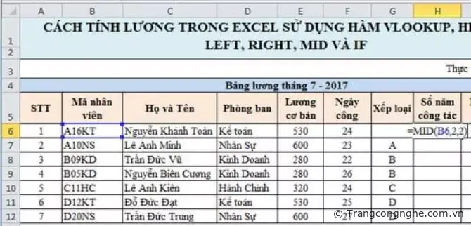 Để điền Số năm công tác, chúng ta sẽ sử dụng hàm Mid để lấy 2 ký tự ở giữa của Mã nhân viên.