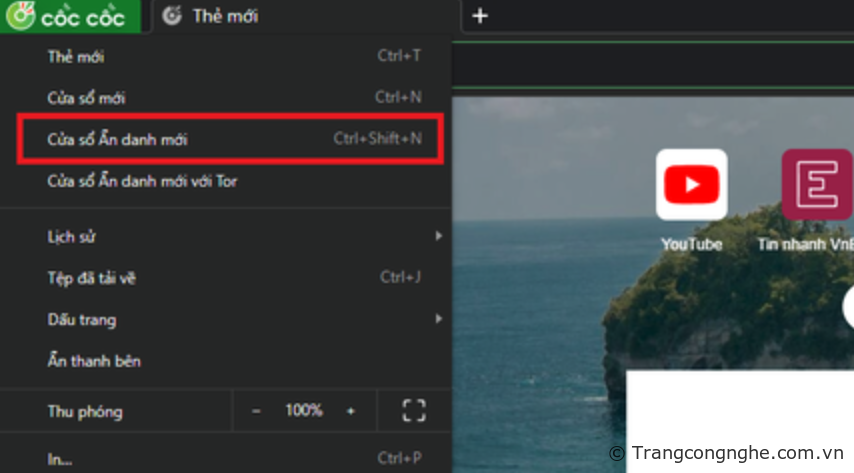 Cách 1: Mở trình duyệt Cốc Cốc tại góc trái bên trên màn hình chọn biểu tượng "Cốc Cốc" chọn "Cửa sổ ẩn danh mới"