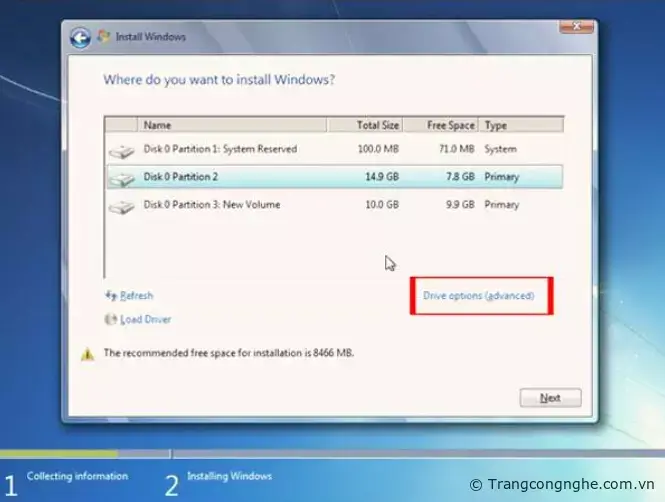 Bước 4: Bước vào phần Where do you want to install Windows bạn hãy chọn ổ C, nếu như ở đó không hiển thị tên ổ bạn hãy để ý dung lượng ổ cứng được ghi trên đó tương đương với ổ C của bạn. Rồi bấm Drive Options (Advanced).