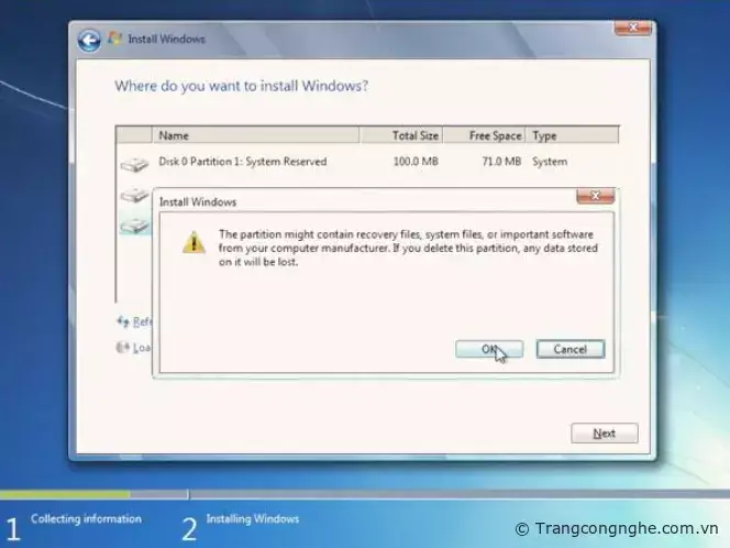 Vẫn là cảnh báo của cài đặt về file và dữ liệu hệ thống sẽ bị xóa ở trên ổ cứng bạn chọn, bấm OK nếu bạn muốn xóa hoàn toàn phân vùng ổ cứng trên máy tính. Việc này khác một chút so với Format là việc bạn xóa/delete khiến cho phân vùng đó mất đi hoàn toàn chứ không còn như Format vì vậy sau khi xóa phân vùng bạn sẽ phải tạo mới.