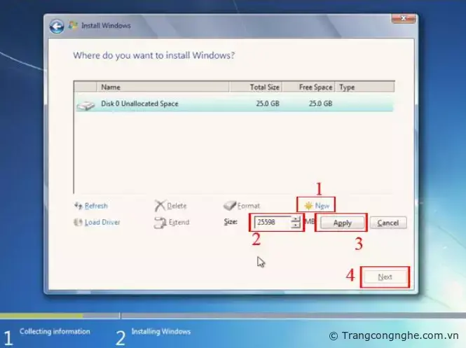 Bước 8: Để tạo phân vùng mới chúng ta chọn New (1) sau đó chọn Size (2) cho dung lượng phân vùng mới, dung lượng ở đây được tính bằng MB (1GB bằng 1024 Mb) thì ở đây dung lượng là 25598MB tương đương 25GB, bạn có thể tùy chọn dung lượng cho phân vùng mới và bấm Apply rồi cuối cùng chọn Next để hoàn tất.