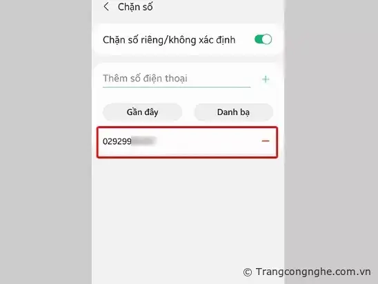 Tại đây, danh sách số điện thoại bạn đã chặn sẽ được hiện ra và bạn cũng có thể chỉnh sửa và Thêm liên hệ bị chặn bằng cách nhấn vào dấu '+'và Xóa liên hệ bị chặn bằng cách nhấn vào biểu tượng dấu '-'.