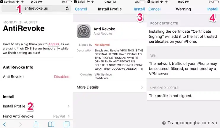 Bước 1: Truy cập tới địa chỉ Anti Revoke, nhấn nút Install Profile và đợi khoảng vài giây để liên kết chuyển tiếp sang giao diện Cài đặt Cấu hình. Tiếp tục nhấn nút Install (góc trên bên phải màn hình) để cài đặt. Lưu ý là bắt buộc phải mở bằng trình duyệt mặc định Safari nhé các bạn. Nếu xem trực tiếp trên mạng xã hội Facebook hoặc trình duyệt web khác thì vui lòng sao chép link trong bảng mã phía dưới vào Safari.
