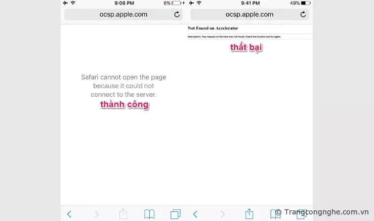 Bước 2: Mở trình duyệt Safari (hoặc bất kỳ trình duyệt nào đều được) và truy cập liên kết ocsp.apple.com để kiểm tra tình trạng kết nối. Nếu như trên trình duyệt xuất hiện dòng chữ 'Safari cannot open page because it could not connect to the server.' thì quá trình cài đặt hoàn toàn chính xác. Nếu như xuất hiện dòng chữ 'Not Found on Accelerator v.v...' thì bạn thử làm lại các bước trên nhé!