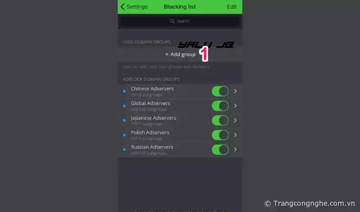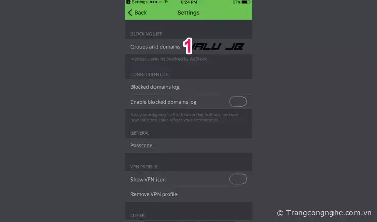 Sau khi cài đặt xong bạn mở ứng dụng AdBlock, vào Cài đặt và chọn mục 'Nhóm và tên miền (Groups and domains)'