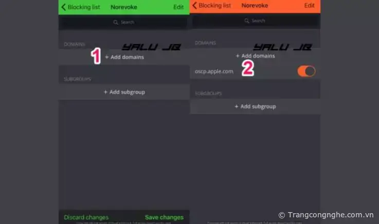 Chọn nhóm mới tạo (theo bài viết là Norevoke), tiếp tục thêm tên miền (Add domains) ocsp.apple.com vào AdBlock và kích hoạt chặn (ở bên phải tên miền) là xong! Bạn phải luôn bật AdBlock và không được tắt ở chế độ chạy nền thì mới có tác dụng nhé!