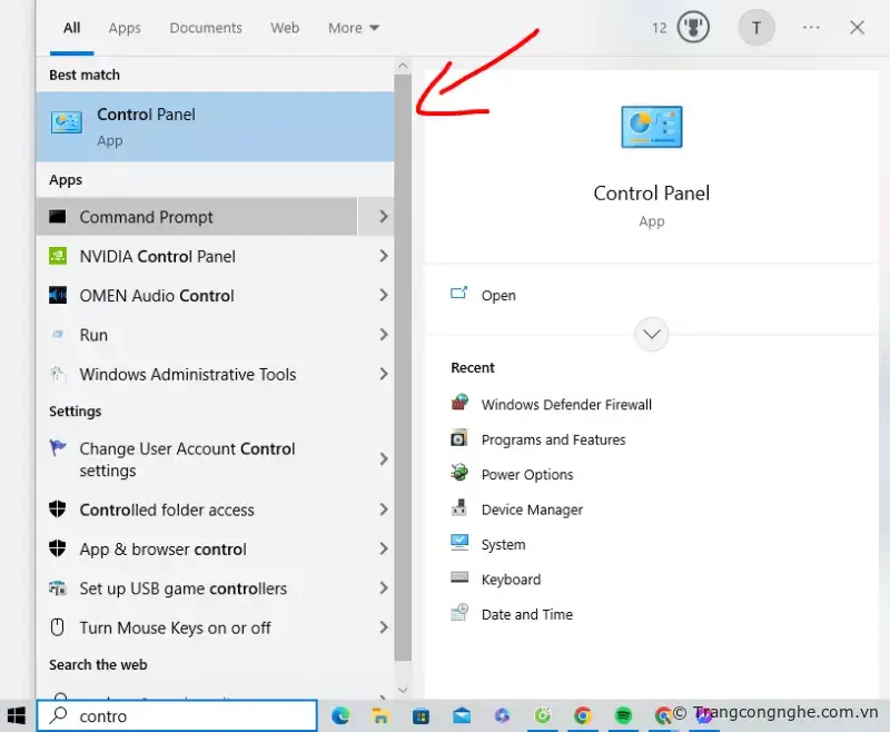 Đầu tiên, các bạn nhấp vào khung Search, gõ từ khóa Control Panel, sau đó nhấp vào kết quả tương ứng ở trên cùng.