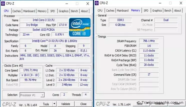 Ở đây chúng ta sử dụng phần mềm CPU-Z, ở tab CPU cung cấp các thông số của các CPU. Ở tab Memory, cung cấp các thông số của RAM.