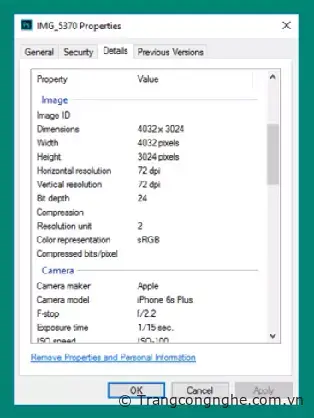 Tới tab Details và bạn sẽ thấy tất cả các thông tin về hình ảnh ở đây.