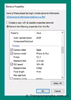 Cách thứ hai là bạn sẽ xóa các thuộc tính ngay trên tệp ảnh gốc. Nhấp chọn Remove the following properties from this file và tích vào ô bên cạnh những chi tiết mà bạn muốn xóa. Cuối cùng, nhấp chọn OK.