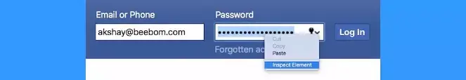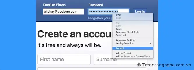 Bước 2: Lúc này thông tin tài khoản của bạn như email đăng nhập và mật khẩu sẽ được nhập sẵn nhờ một trường tự động điền của trình duyệt > chọn phần mật khẩu và click chuột phải vào nó > sau đó chọn 'kiểm tra phần tử (inspect)'.