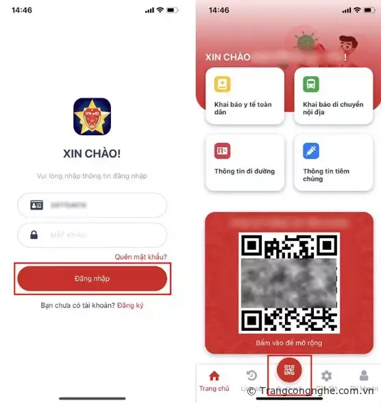 Bước 2. Bạn mở ứng dụng VNEID, tiến hành Đăng nhập. Nếu chưa có tài khoản, nhấn Đăng ký. Sau đó chọn Quét mã.