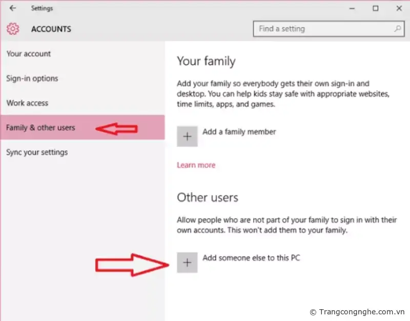 Ở tùy chọn “Family & other users”, bạn có thể thêm tài khoản cho các thành viên trong gia đình bằng cách click vào đấu cộng ở mục “Add a family member” hoặc cho người khác ở mục Other User, click vào “Add someone else to this PC”. Người dùng cũng có thể thêm tài khoản cho con mình và kiểm soát tài khoản đó.