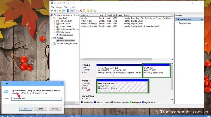 Bước 1: Sử dụng tổ hợp phím Windows + R, nhập diskmgmt.msc sau đó nhấn Enter.