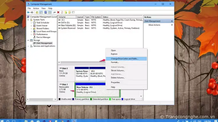 Bước 2: Click phải ổ đĩa cần khắc phục chọn Change Drive Letter and Paths.