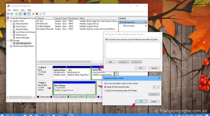 Bước 3: Để thay đổi tên của ổ đĩa, hãy tiếp tục click phải chọn Change Drive Letter and Paths. Click Add để thêm ký tự đại diện cho ổ đĩa.