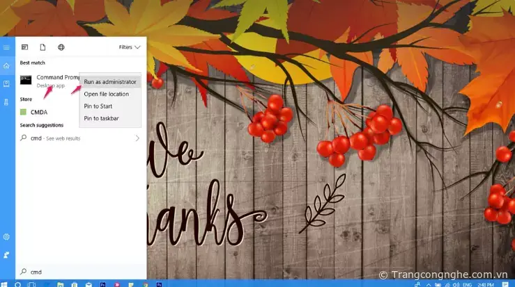 Bước 1: Nhập cmd vào thanh Search và chạy với quyền Administrator.