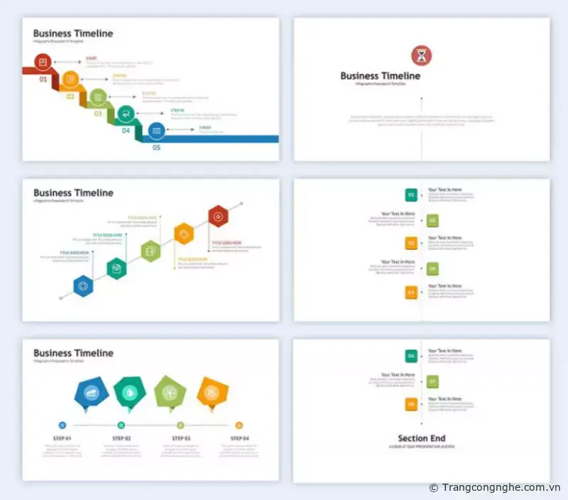 Các mốc thời gian có thể được sử dụng theo nhiều cách khác nhau trong một bài thuyết trình. Một dòng thời gian có thể ở trong một slide hoặc nó có thể được kéo dài liên tục kết nối giữa các slide với nhau. Bạn có thể tạo dòng thời gian với các biểu tượng có sẵn, hoặc với các hình khối hoặc trên một đường thẳng kéo dài. Dòng thời gian có thể là một cách trực quan để giải thích một sự kiện theo thời gian hoặc một kế hoạch hành động cần được quan tâm. Hãy chắc chắn rằng dòng thời gian phù hợp với phần còn lại của chủ đề.