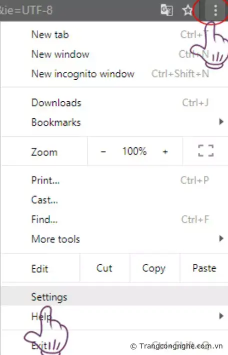 Bước 1: Tại giao diện Chrome, các bạn click vào biểu tượng dấu 3 chấm dọc ở góc trên bên phải rồi chọn Cài đặt (Settings)