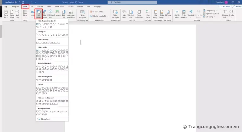 Bước 1: Trước tiên chúng ta sẽ thực hiện việc vẽ mũi tên trong Word, bằng cách bạn vào Insert -> Shapes và lựa chọn kiểu vẽ mũi tên trong Word mà bạn cần chèn.
