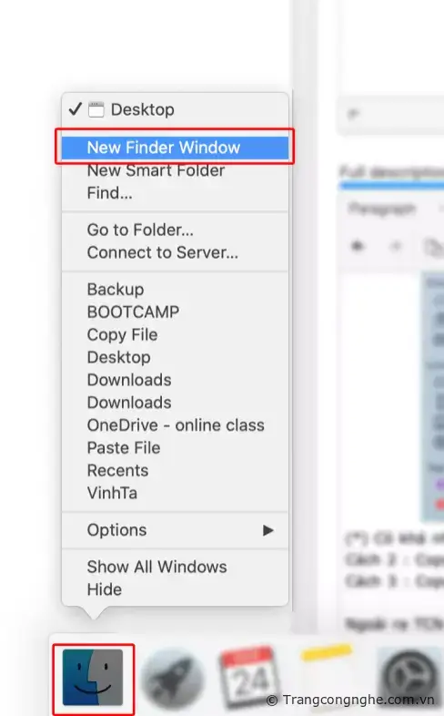 - Dưới thanh Dock bạn tìm tới Finder và chuột phải và chọn New Finder Window