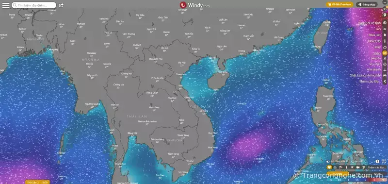 Khi mới vào Windy sẽ hiển thị cho bạn sức gió đang có trên khu vực, nếu thấy những dòng gió xoáy sâu vào một vùng thì có thể đó là áp thấp nhiệt đới hoặc bão, dòng gió chảy càng nhanh thì có nghĩa là gió ở vùng đó thổi càng mạnh. Bạn có thể thấy trên biển đông đang có Cơn bão số 3 nên sẽ có một vòng xoáy ở đó.