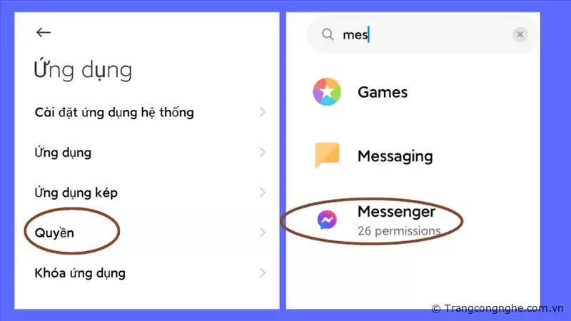 Bước 2: Tìm và chọn "Messenger" trong danh sách các ứng dụng đã cài đặt trên điện thoại của bạn. Bạn sẽ thấy các tùy chọn khác nhau. Hãy tìm và chọn "Quyền" hoặc "Quyền truy cập".