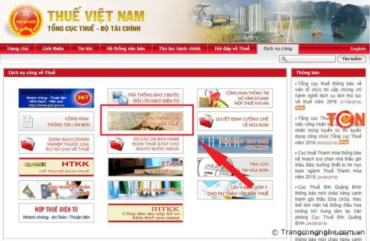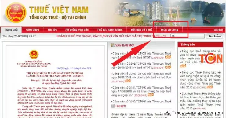 Bước 1: Truy cập trang chủ chính thức của Tổng cục Thuế TẠI ĐÂY. Để thực hiện tra cứu chứng minh thư nhân dân tìm mã số thuế, các bạn ấn vào Dịch vụ công.