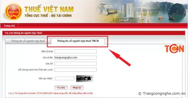 Bước 4: Có thể chỉ cần nhập mỗi số CMND để xem ngay mã số thuế. Hoặc nếu bạn nhớ các thông tin thì có thể nhập đầy đủ: Mã số thuế, họ và tên, Địa chỉ, mã xác nhận và ấn Tra cứu.