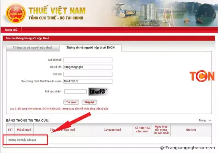 Lập tức thông tin cá nhân và mã số thuế của bạn sẽ được hiển thị bên dưới. Ngoài ra nếu bạn nhập sai số chứng minh thư nhân dân, hoặc số CMND chưa đăng ký mã số thuế thì sẽ Không tìm thấy kết quả.