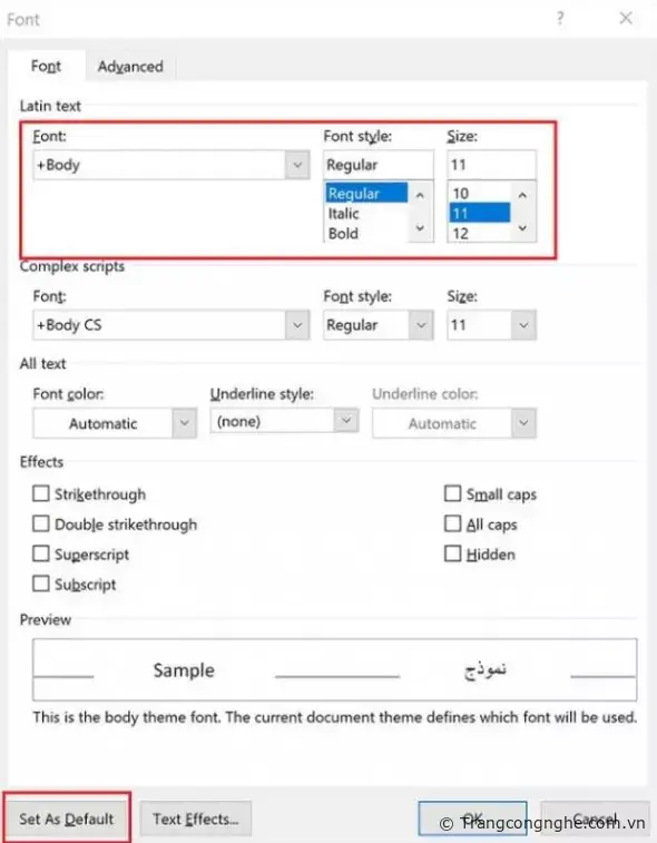 2. Ở bảng mở ra, bạn có thể chọn font mặc định từ menu thả xuống cho chữ Latin cùng kích thước và kiểu mặc định.